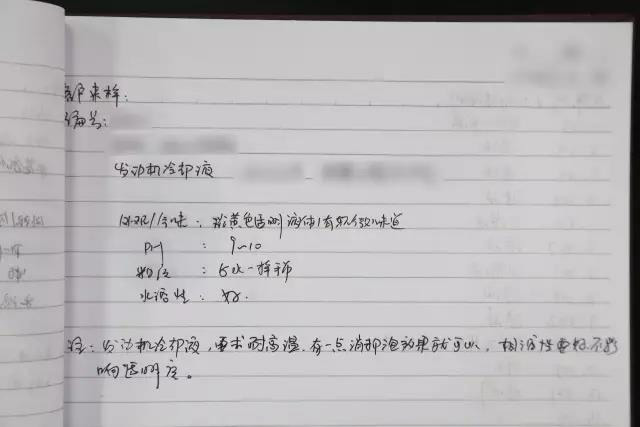 來樣一瓶發動機冷卻液,重約500g;取樣,可知其為帶有輕微氣味的淡黃色透明液體,pH值為9~10,呈堿性;粘度與水差不多,水溶性好。